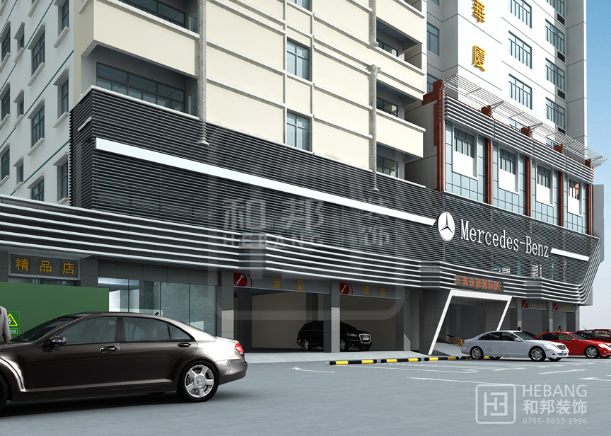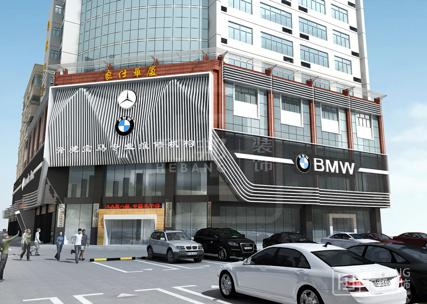 高端大氣的現代設計:以汽車頭部為原型設計的門頭,大膽新穎,創新十足。分區設計,奔馳與寶馬維修店分布兩旁,使整個維修機構美觀大方。