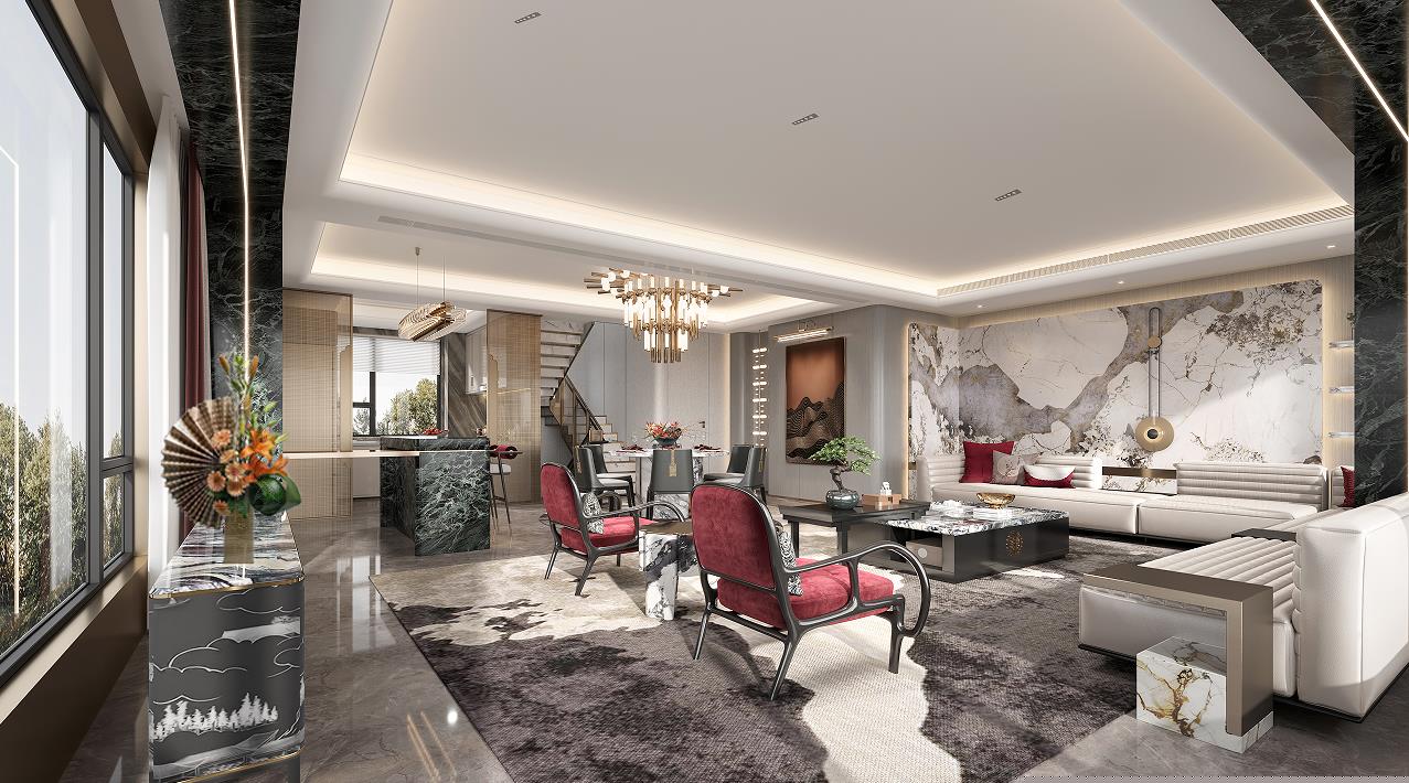 一層見山為題,強調一種寬廣的、壯闊的詩意生活。基于建筑條件中極具優勢的景觀資源條件,整體空間以向外打開的通透意境處理界面與層次關系,渾厚而瑩潤的古銅色調以匹配大開大合的空間尺度而營造出居室特有的生活氛圍。開門見山,獨享豁達人生。
