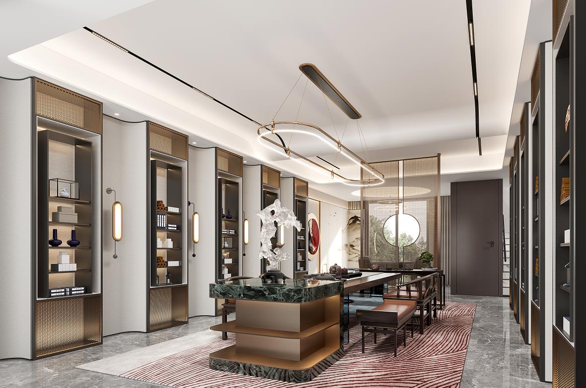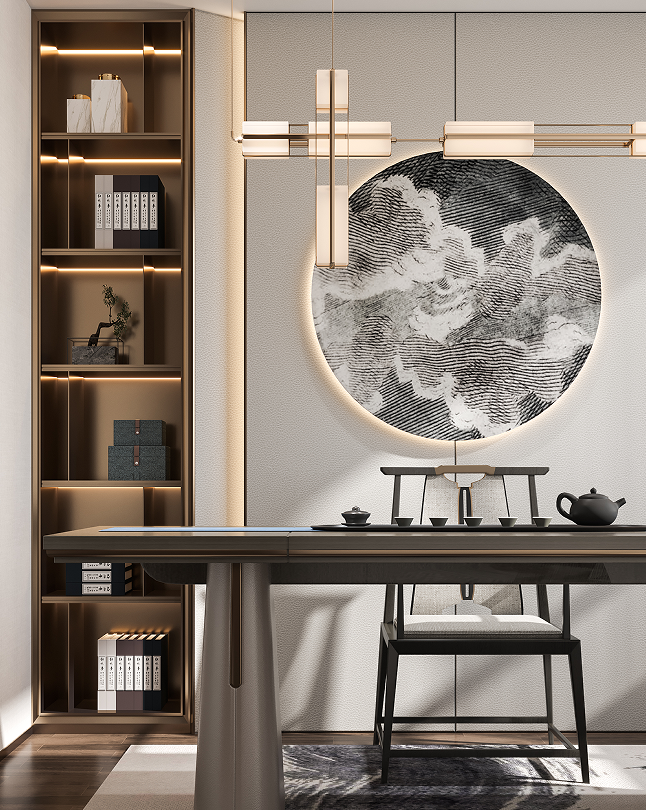 負一層會客廳打造為男主人的社交空間,精致的茶臺,私享的收藏展閱,是屬于和朋友閑談、聊天的專屬場所。