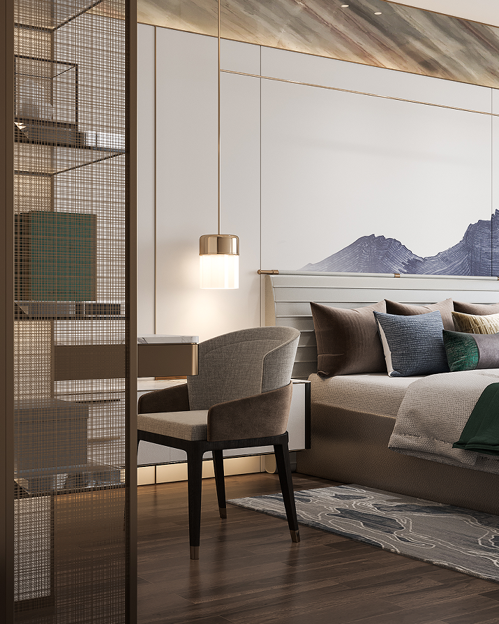 二層主臥空間環景式體驗主臥套間形式,擁有超大景觀視野,并配備了獨立衣帽間、衛浴室。軟裝將裝飾的重點放在了色彩的呼應關系、與面料觸感與肌理給予人的真實體驗之上,隨處可見的進口家具產品將主人的品味于隨意處散發,呈現了一處格調高雅的休憩空間。