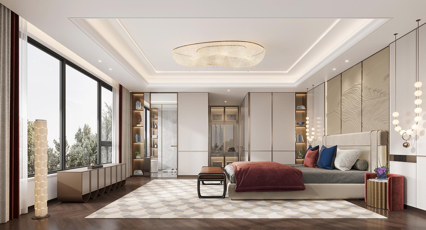 二層主臥入戶門采用了雙開門入戶形式,配備了功能完備,且尺度寬闊的全定制衣帽間及獨(dú)立衛(wèi)浴室。淺藍(lán)色極具包裹感的床,愜意而溫暖,獨(dú)特的選型成為主臥的視覺亮點(diǎn),展現(xiàn)著主人時(shí)尚大氣的品味特質(zhì)。