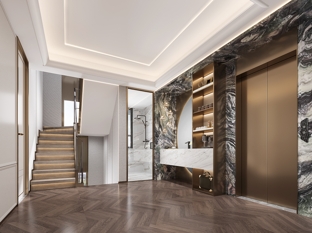 上疊一層多功能家庭活動(dòng)室滿足聚會(huì)、觀影、沙龍等多樣化生活場(chǎng)景,紋理天然的背景奢石、鏡面水紋不銹鋼,幻化成熠熠生輝的發(fā)光源在空間中閃耀,為聚會(huì)增添了更為閃亮的氛圍。