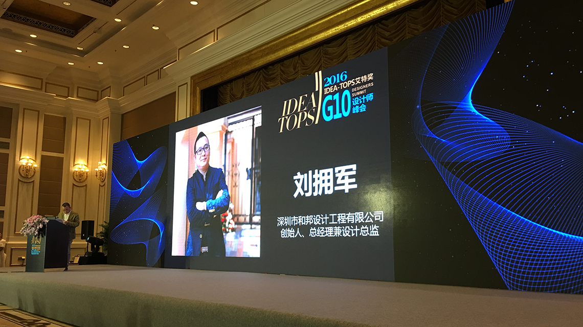 2016年國際空間設計大獎——艾特獎!G10設計峰會上,鑒于和邦裝飾劉擁軍先生在室內設計領域的突出表現和卓越成就,應邀參加了G10設計峰會圓桌會議,對【未來中國的室內設計方向探討】作了方向性的報告,得到了中外設計師從業者的高度贊揚。